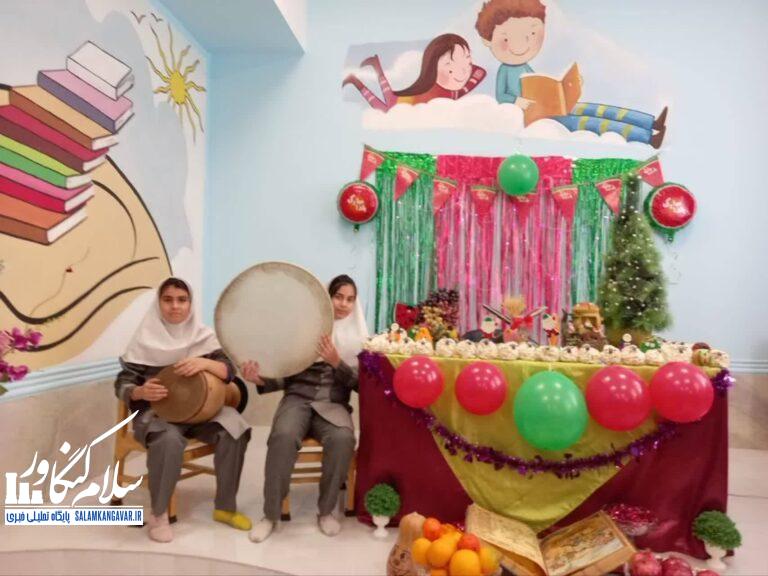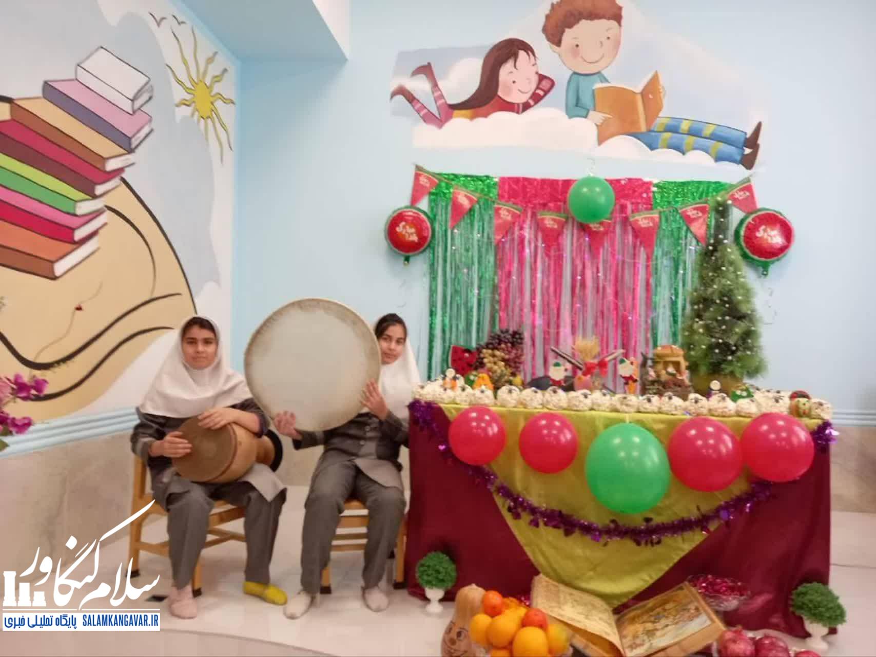 به گزارش پایگاه خبری تحلیلی سلام کنگاور دراین مراسم جشن وسرور، با به پاداشتن میزی زیبا وبا گزینش وچینش نمادهای ملی و ویژه یلدا مانند شاهنامه چاپ امیربهادر به خط عماد الکتاب جلوه ای چشم نواز پدید آمد وبرنامه های گوناگونی مانند شاهنامه خوانی،قصه گویی،شعر خوانی با موضوع یلدا،نقالی،اجرای موسیقی سنتی وتنبک زنی و دف نوازی واجرای بازی وسرگرمی ، مسابقه طناب کشی اجرا شد.